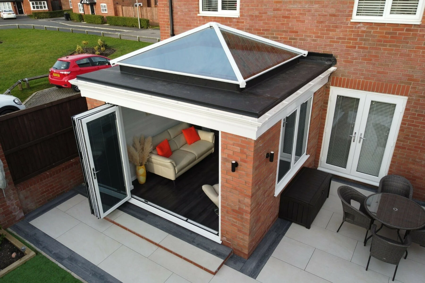 A conservatory has 75%+ glass in the roof and 50%+ in the walls — light, airy, garden-room feel. An orangery has a solid perimeter roof with a central glazed lantern — more like a traditional extension. We build both – your choice depends on use, budget, and planning.